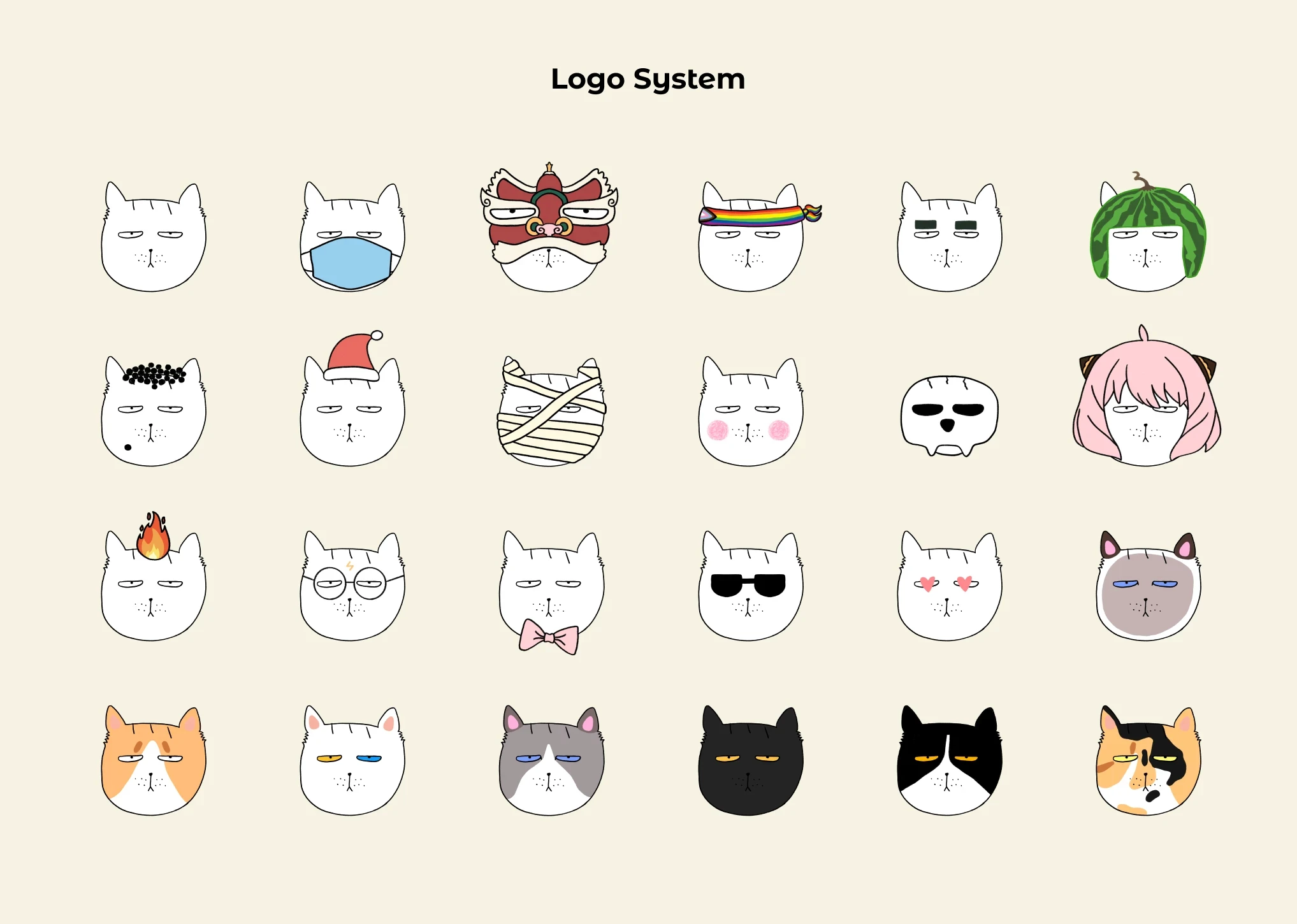 The logo features a grumpy white cat with a playful stop-motion effect, maintaining its judgmental expression to showcase our affection for sassy and opinionated cats. The logo employs a white base for the cat's face, granting cat owners the freedom to draw their cats' own patterns. This approach aims to evoke the sense of identity people have with their specific cat breeds while also fostering greater interaction with the brand, thereby providing a wider range of possibilities to establish deeper connections with cat owners, ultimately creating a stronger sense of community.