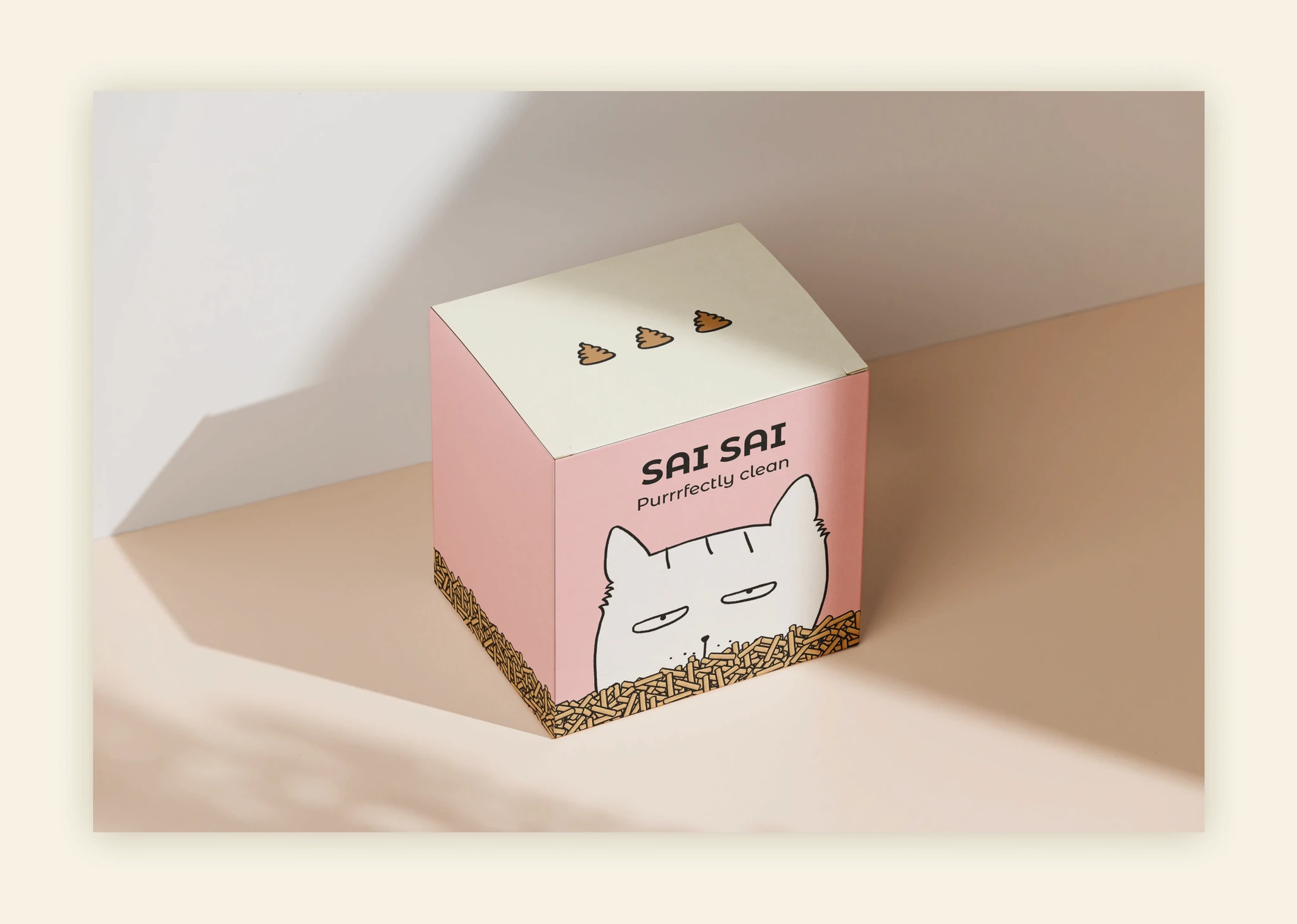 A cat cleaning brand with a mission to redefine the role of a cat poop-picker (鏟屎官). This project involved the inception of SAI SAI, a brand deeply rooted in Taiwanese linguistic quirks where "屎 sái" humorously references poop and "屎面 sái-bīn" mirrors the grumpy or displeased expressions that we adore in cats. This linguistic twist became the cornerstone for a brand that seamlessly melds cultural heritage with the whimsy of feline charm.
