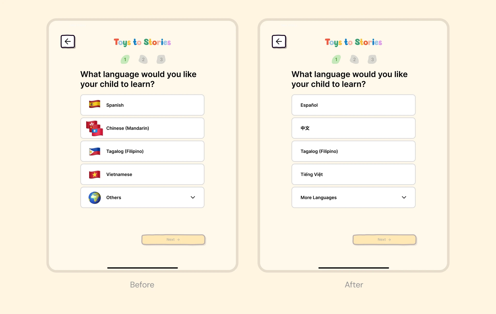 Iteration: Replaced flags with native language labels (e.g., “Español”, “中文”) to shift focus from national identity to language itself, and changed "Others" to "More Languages"