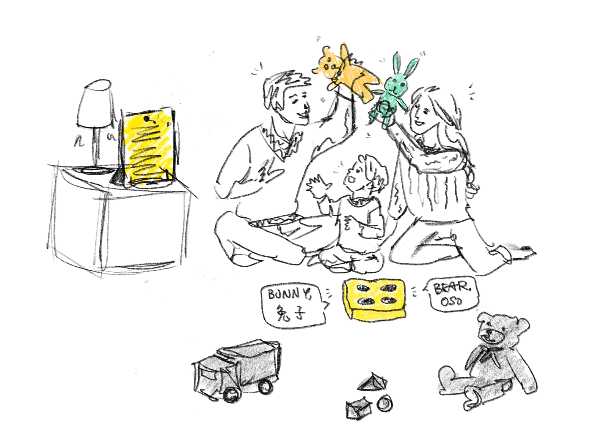 Empower bilingual families in supporting their children’s early bilingual language development through turning toys into interactive storytelling.