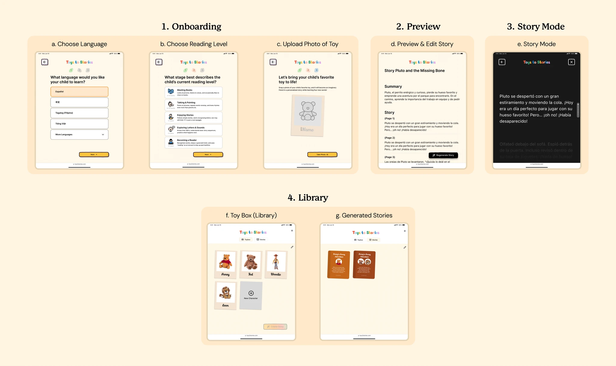 To minimize the effort of story creation for busy parents, we structured the app into three simple sections: Onboarding, Preview, and Story Mode and Library.